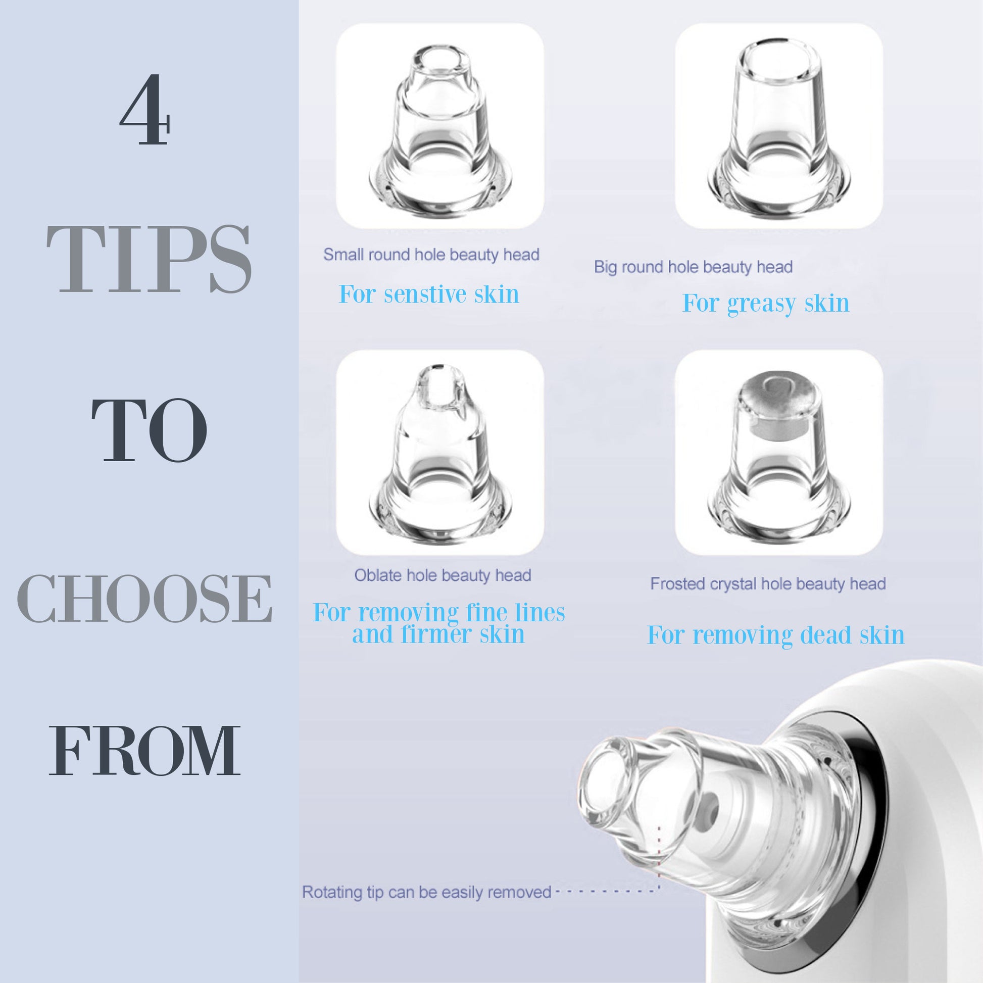 Mini pore vacuum, 4 tips (update to your exact count), USB charging cable, user guide, spare filters (if included).