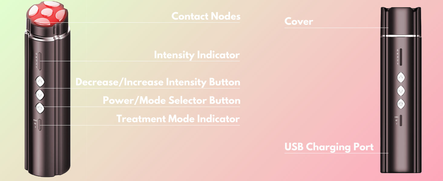 - Modes/Functions: RF + red light, EMS microcurrent, cooling + blue light